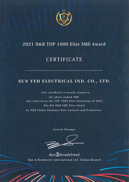 Sun Yeh has been awarded the Top 1000 Elite Award three times. We were selected from 1.46 millions companies and deeply honored to be given recognition to our competitiveness and performance. Thank you for all of your continued support.